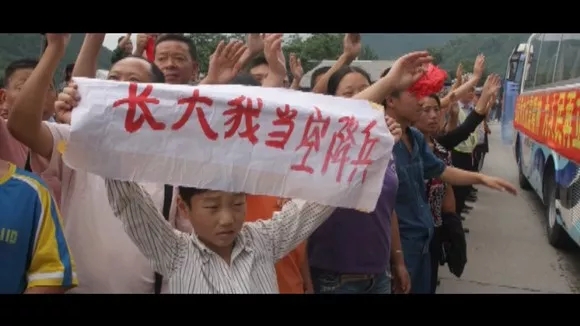 △2008年,汶川地震后,程強舉起“長大我當空降兵”的標語。