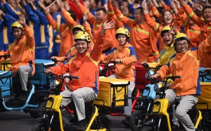 群眾游行隊伍中,還出現了我們熟悉的“特殊面孔”——快遞小哥。他們代表了眾多的基層勞動者和一線奮斗者。
