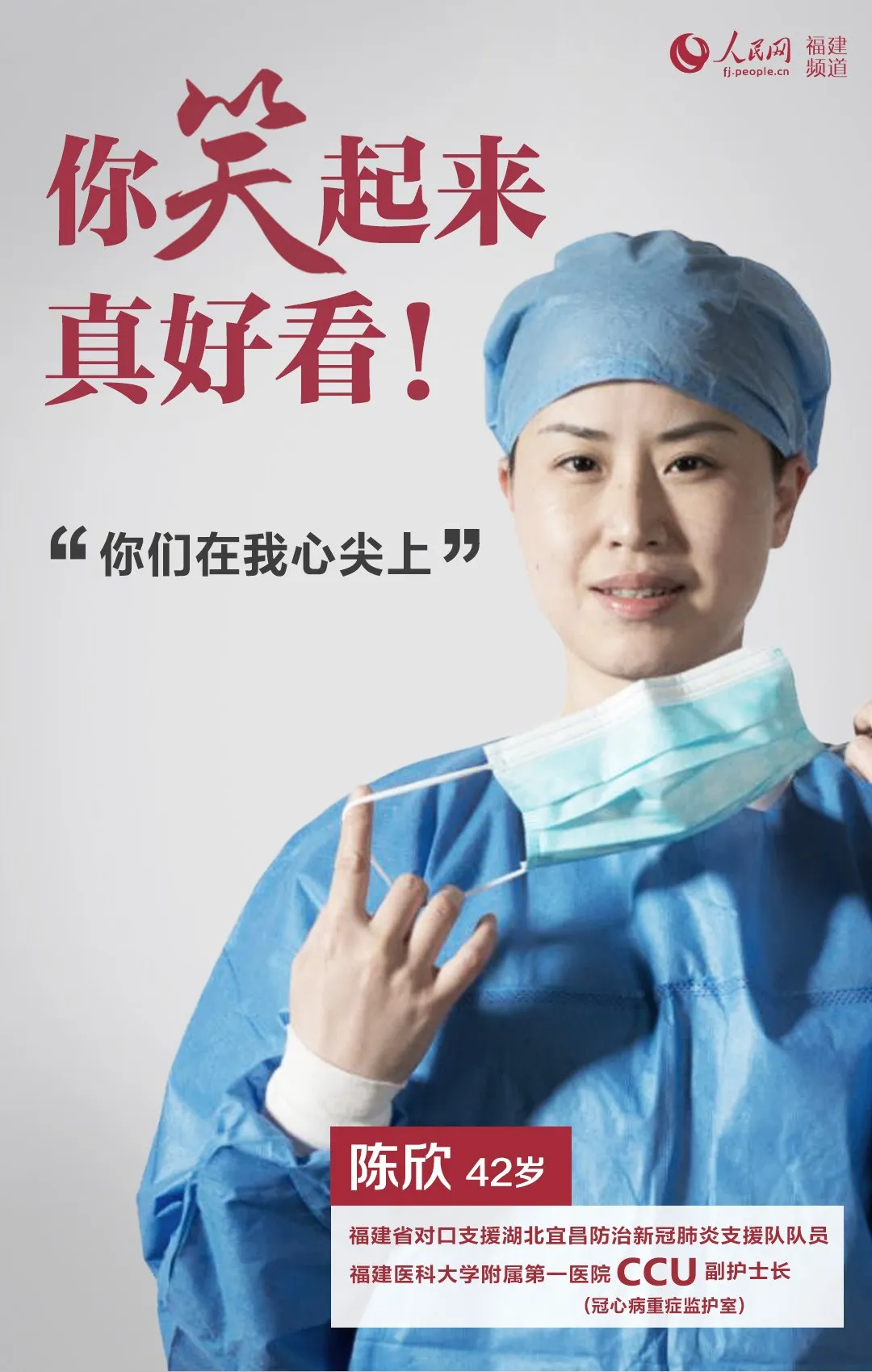 3月5日至6日,湖北省宜昌市委宣傳部、宜昌市文聯組織市攝影家協會為274名援宜支援隊隊員“畫像”,用鏡頭留下“白衣戰士們”的最美瞬間。人民網福建頻道特制系列海報“你笑起來真好看”,致敬奮戰在戰“疫”一線的女性醫護工作者,三八婦女節快樂!