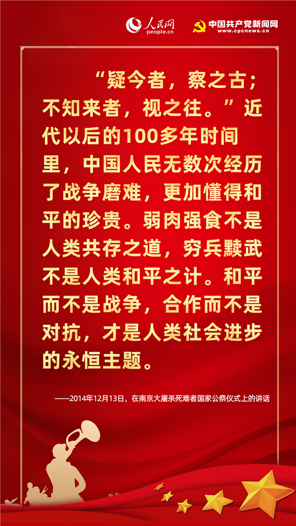 歷史不僅關乎過去,更關乎現在和未來。紀念歷史不是為了咀嚼苦難、延續仇恨,而是為了重申和平與正義的價值,從歷史中汲取智慧,獲得開創未來的精神力量。在七七事變83周年的今天,人民網·中國共產黨新聞網梳理十八大以來習近平總書記有關“戰爭與和平”的重要論述,讓我們一起“銘記歷史、緬懷先烈、珍視和平、警示未來”。