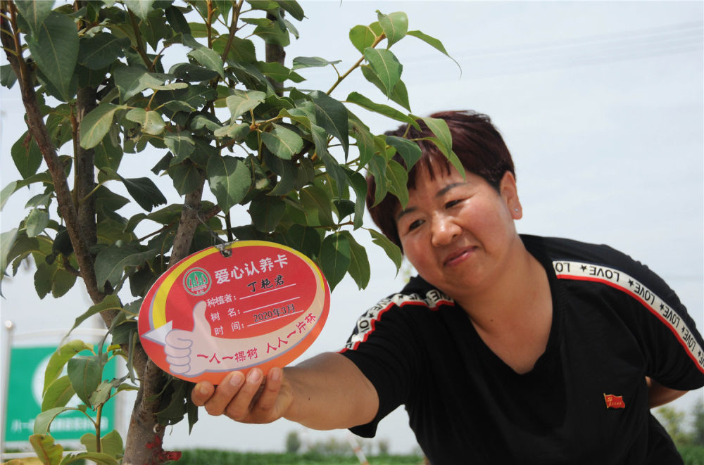 丁艷君展示在自己栽種果樹上懸掛的愛心認養卡。(新華社記者李云平攝影) 八一村黨支部書記唐占江說,今年全體村干部帶頭干,黨員、志愿者率先干,帶動村民積極干,全村1517人種了3700多棵樹,栽種和管護工作全部由村民自己負責,一人栽活一棵樹成為村民共同的心愿。