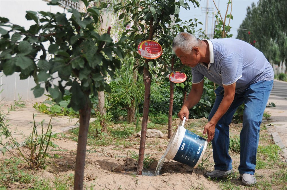 梁興泰正在給自己栽種的果樹澆水。(新華社記者李云平攝影) 八一村街道兩側都種著杏樹、蘋果梨樹等,每棵樹上還掛著紅色的愛心認養卡,上面標有種植者、時間等。 村婦聯主任丁艷君說:“為了增加大家管護樹木的責任感和榮譽感,我們在樹上掛了愛心認養卡,時刻提醒村民照顧好自己的樹苗,這些被認養的樹苗全部成活,沒有一棵受到損傷?!?/p>