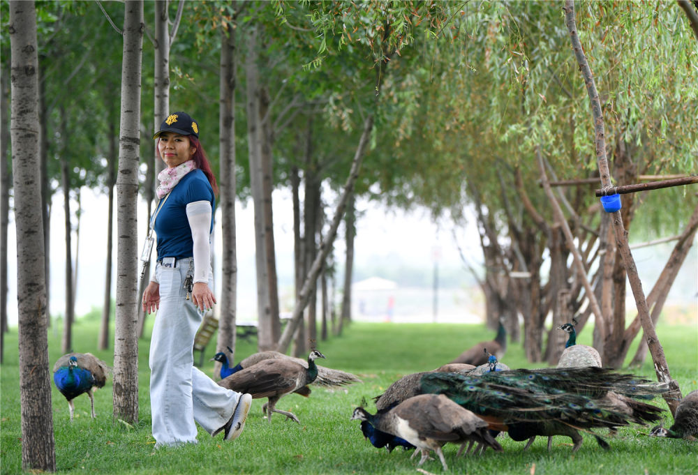 工作人員在曙光水鎮內照看孔雀。(新華社記者李然攝)