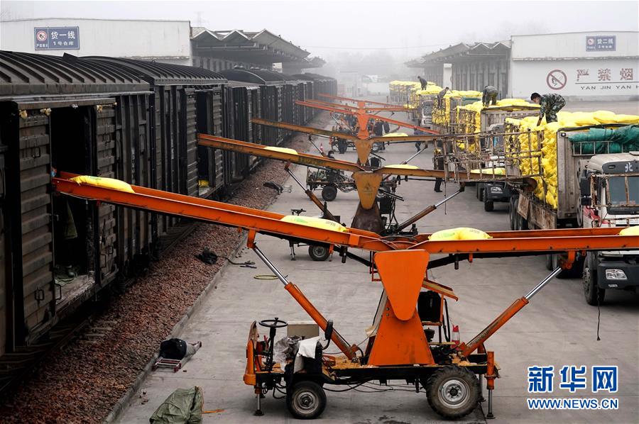 在中國鐵路鄭州局集團有限公司開封車站,工作人員使用傳輸機裝運春耕物資(2月13日攝)。 新華社記者 李安 攝
