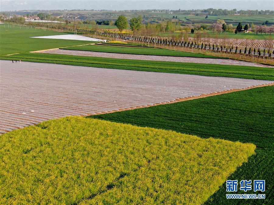 這是洛陽市洛寧縣小界鄉一處油菜、西瓜、小麥間種的農田(4月13日攝,無人機照片)。 新華社記者 李安 攝