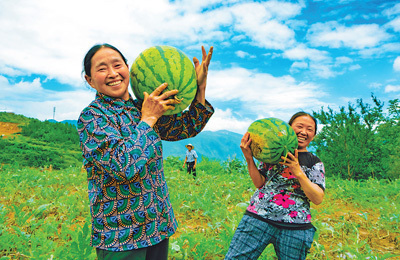 村民舉著收獲的西瓜,充滿喜悅。