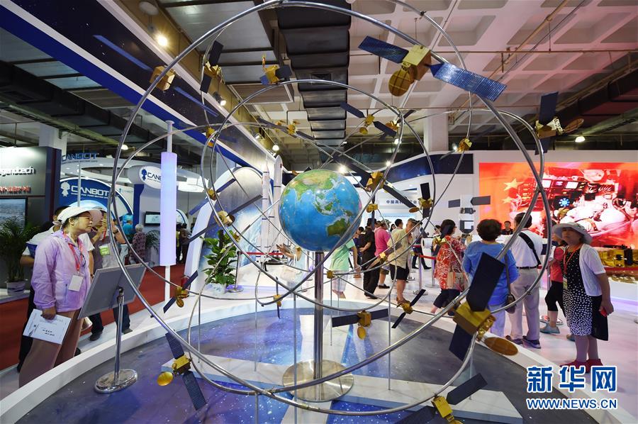 2017年6月9日,參觀者在第二十屆中國北京國際科技產業博覽會上參觀展出的北斗衛星導航系統模型。 新華社記者 鞠煥宗 攝