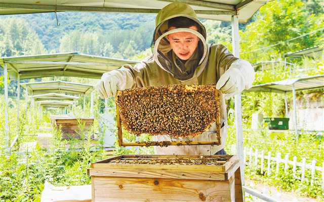 △石柱縣中益鄉,蜂農查看蜜蜂生長和產蜜情況。