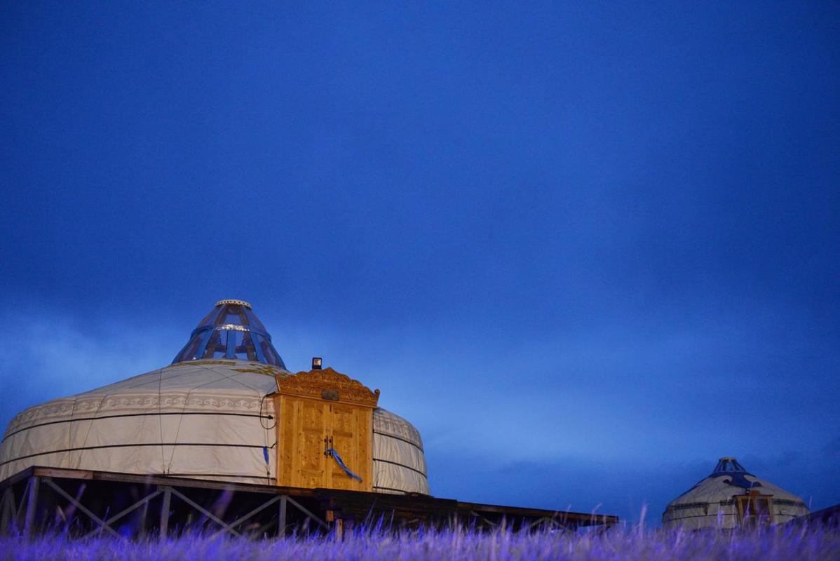晚飯后,面朝呼和諾爾湖,天空是深邃的藍。夜晚的蒙古包,靜謐又祥和??梢院煤孟硎懿菰囊股?,早上日出后又是充滿熱情的人們,向你獻上最好的禮遇。