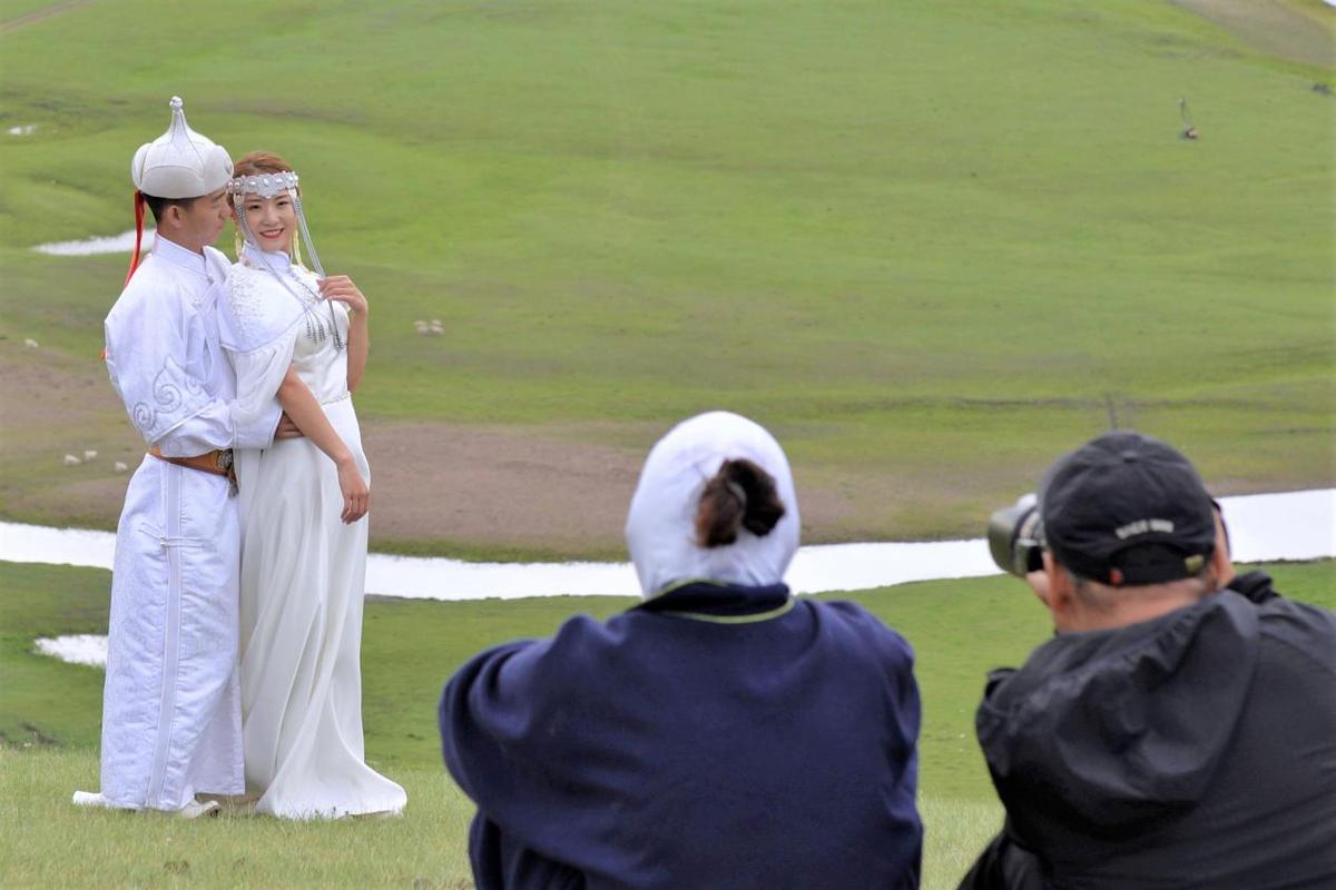 穿戴著當地服飾的一對新人在呼倫貝爾大草原莫日格勒河畔拍攝婚紗照。