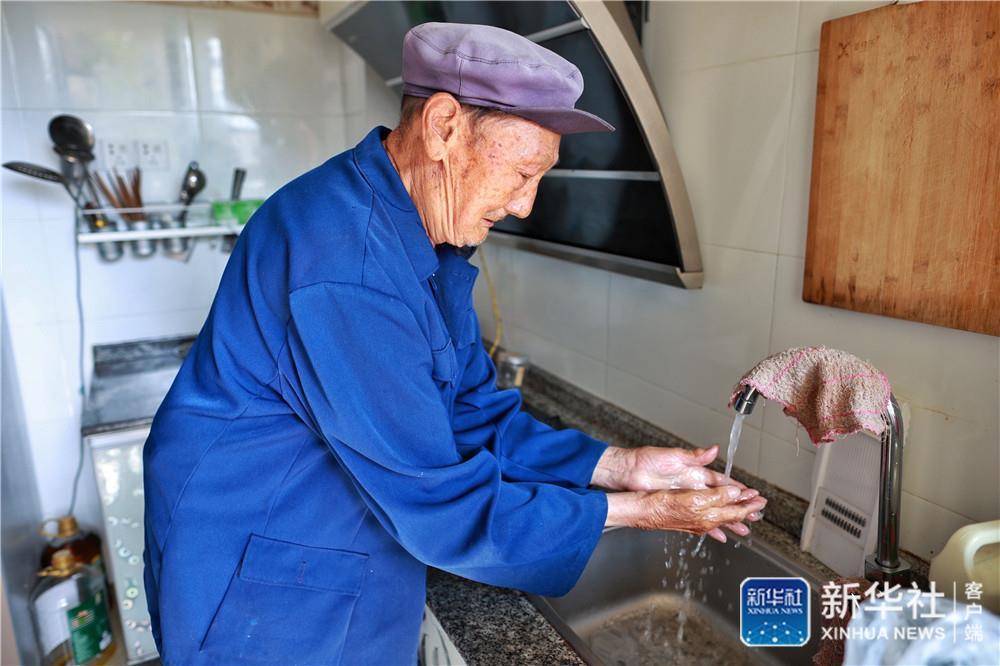 ↑石連英在柏楊林易地扶貧搬遷安置點家中洗手(8月3日攝)。劉續 攝