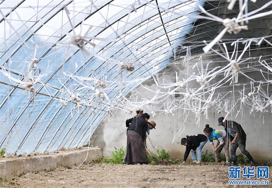 格桑旺姆(右三)與姐姐德吉卓瑪(右二)帶領工人在蔬菜大棚內翻地,準備種新的蔬菜。