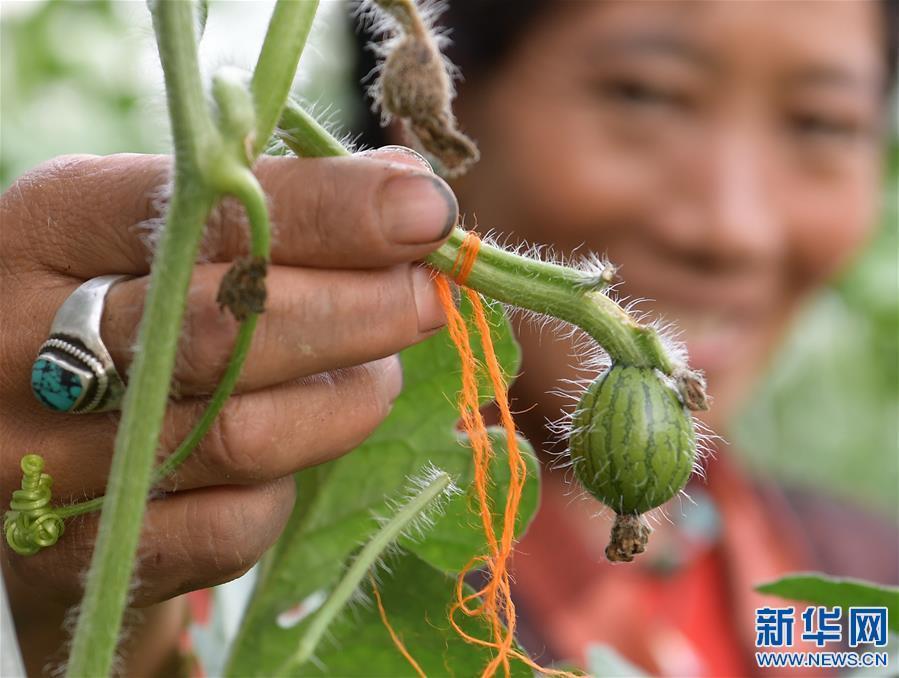 格桑旺姆姐妹家大棚內的瓜秧上結出的小西瓜。