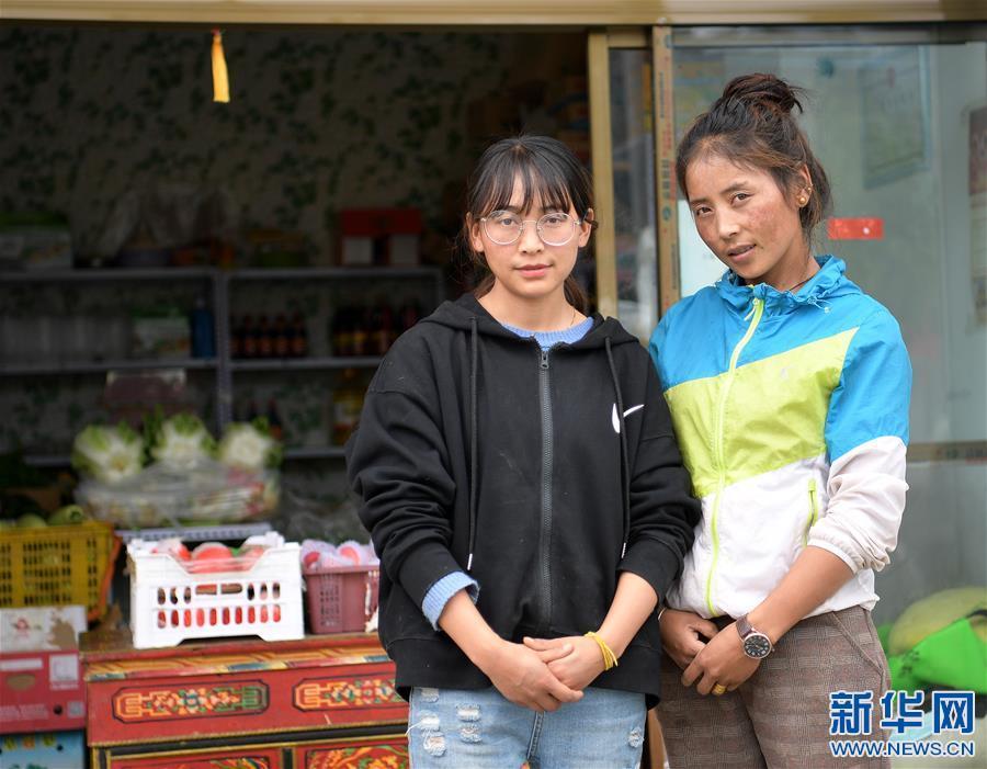 格桑旺姆(左)和姐姐德吉卓瑪在位于白朗縣的蔬菜店鋪前合影。