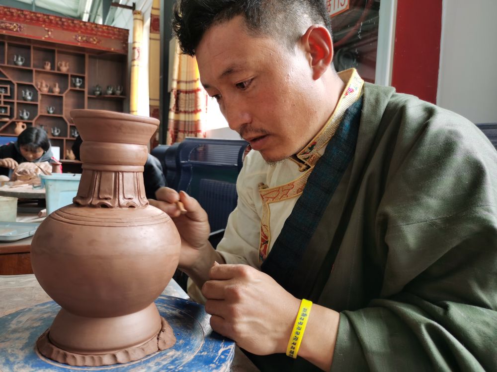囊謙黑陶歷史悠久,山榮村被稱作“黑陶之鄉”。村里成立了企業,將現代藝術的創作理念融入黑陶制作中,使囊謙黑陶散發出濃郁特色。黑陶原材料與制作工具都從當地取材,許多村民學手藝“靠山吃山”。