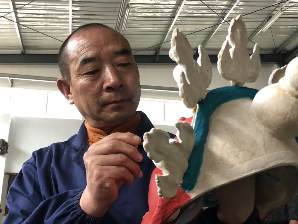 青海玉樹藏族自治州囊謙縣扶貧產業園內,手工藝人在制作傳統面具(7月4日手機拍攝)。新華社記者 李占軼 攝