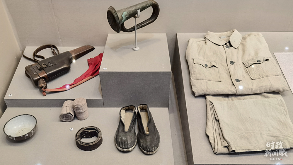 △紀念館里陳列著新四軍的槍套、軍號、軍鞋等。(總臺央視記者張淳拍攝)