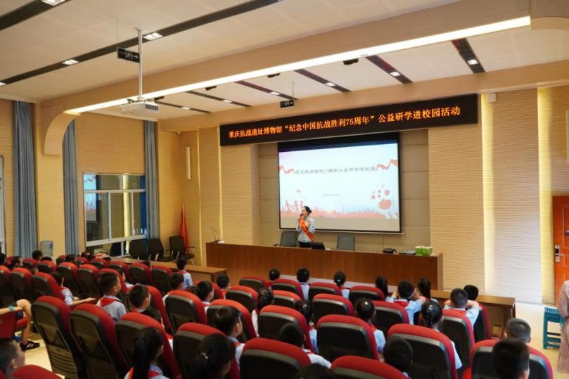 重慶抗戰遺址博物館開啟“紀念中國抗戰勝利75周年”公益研學進校園巡講活動。緊緊圍繞立德樹人這一根本任務,為重慶主城3個區12所學校的4000余名中小學生提供文化公益服務。