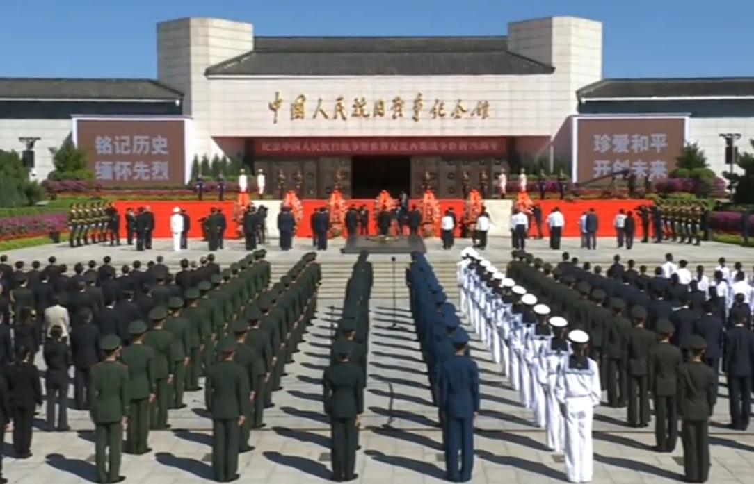 9月3日上午10時,中共中央總書記、國家主席習近平等黨和國家領導人出席了在中國人民抗日戰爭紀念館舉行的紀念中國人民抗日戰爭暨世界反法西斯戰爭勝利75周年向抗戰烈士敬獻花籃儀式。在雄壯嘹亮的國歌聲中,習近平總書記同首都各界代表向在中國人民抗日戰爭中英勇犧牲的革命烈士敬獻花籃。