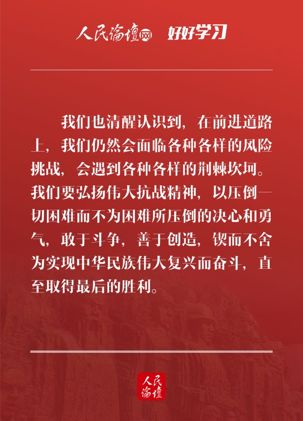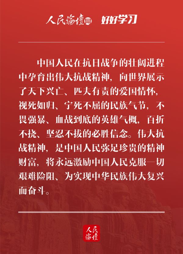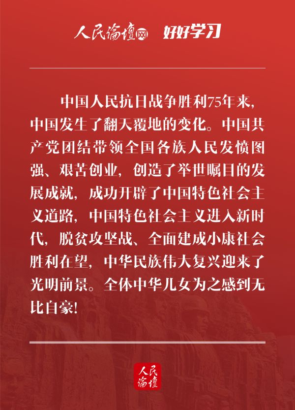9月3日下午,中共中央、國務院、中央軍委在北京人民大會堂舉行座談會,紀念中國人民抗日戰爭暨世界反法西斯戰爭勝利75周年。中共中央總書記、國家主席、中央軍委主席習近平出席座談會并發表重要講話。憶往昔偉大抗戰,感今朝精神永傳。今天,人民論壇網和您一起,在習近平總書記的講話中感受偉大抗戰精神,在新時代繼承和弘揚偉大抗戰精神。