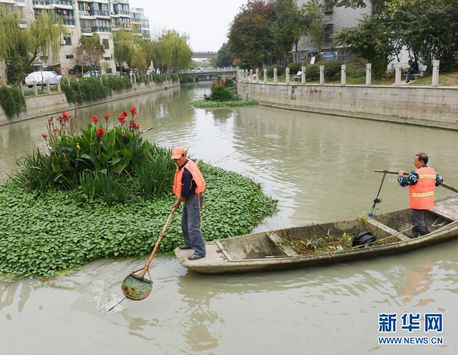 11月16日,工作人員在浙江湖州吳興區環渚街道藤橋港河道里清除雜物。新華社記者 翁忻旸 攝