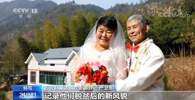 畫面中的主人公不是在拍結婚照,而是補拍婚紗照。他們是橫江村的脫貧戶林英茂夫妻倆,而攝影師則是當地政府請來的,專門為村里的脫貧戶免費拍一組婚紗照。 化妝、拍照、現場洗印,忙碌了40多分鐘,一張美美的婚紗照閃亮出場。 林英茂是2014年建檔立卡貧困戶,在政府的扶持下,通過種植高產油茶、毛竹、楊梅等產業,2016年就順利脫貧。脫貧當年還享受了危房改造資金,拆舊建新建起了一棟小洋樓。脫了貧、致了富,林英茂本也想著給相伴走過46年的老伴完成一個心愿。 萬安縣夏造鎮橫江村脫貧戶 林英茂:我老婆看到年輕人結婚的時候,大家都拍了婚紗照,所以她也有這樣一個想法。今天機會好,又是大晴天,終于完成了她的心愿拍了婚紗照,我感覺這是我一生當中最幸福、最甜蜜的時光。 這張遲到了46年的婚紗照對像林英茂一樣的農村群眾,特別是貧困戶來說有著不一樣的意義。他們這個年紀絕大部分都沒有拍過婚紗照。為這些人群做一件有意義的事,也就悄悄地納入了當地干部的日程。