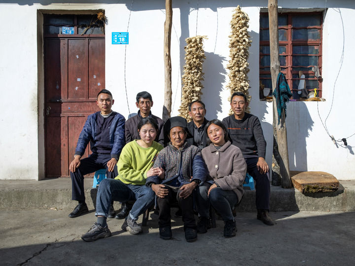 冕寧縣彝海村,沙馬爾各的部分后人,前排中為兒媳蘇久克的莫。(新華社記者沈伯韓攝)