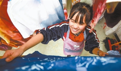 “十三五”期間,我國教育事業發展取得顯著成效,文化事業和文化產業繁榮發展,文化自信不斷增強。圖為2020年12月17日,貴州省黔西縣鐘山小學,學生在體驗蠟染非遺項目?! ≈苡柍瑪z(影像中國)