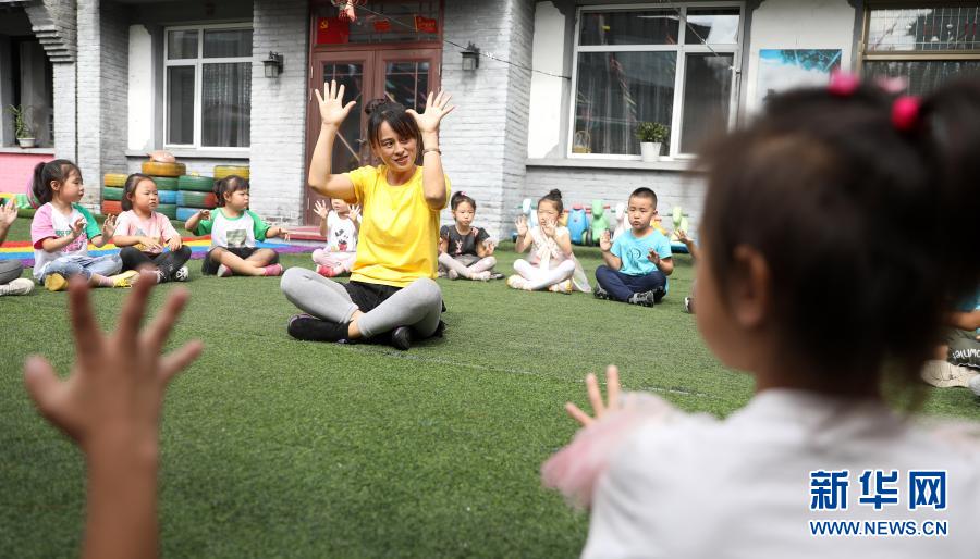 幼教老師在遼寧省鳳城市大梨樹村萌芽幼兒園里帶領孩子們游戲(2020年9月9日攝)。新華社記者 姚劍鋒 攝