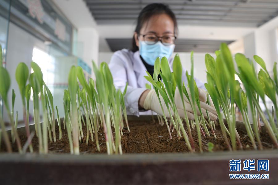 在遼寧東亞種業有限公司種子質量檢測中心,工作人員查看玉米種子發芽實驗結果(2020年3月16日攝)。新華社記者 楊青 攝