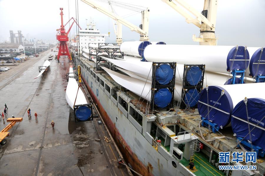 2月28日,一艘貨輪在江蘇連云港港東方公司碼頭裝載風力發電設備。新華社發(王春 攝)