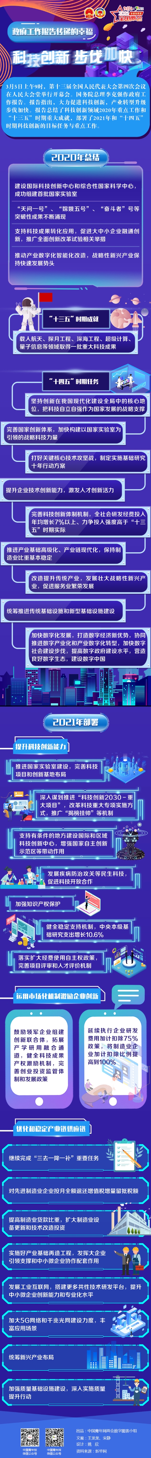 3月5日上午9時,第十三屆全國人民代表大會第四次會議在人民大會堂舉行開幕會。國務院總理李克強作政府工作報告。報告指出,大力促進科技創新,產業轉型升級步伐加快。報告總結了科技創新領域2020年重點工作和“十三五”時期重大成就,部署了2021年和“十四五”時期科技創新的目標任務與重點工作。