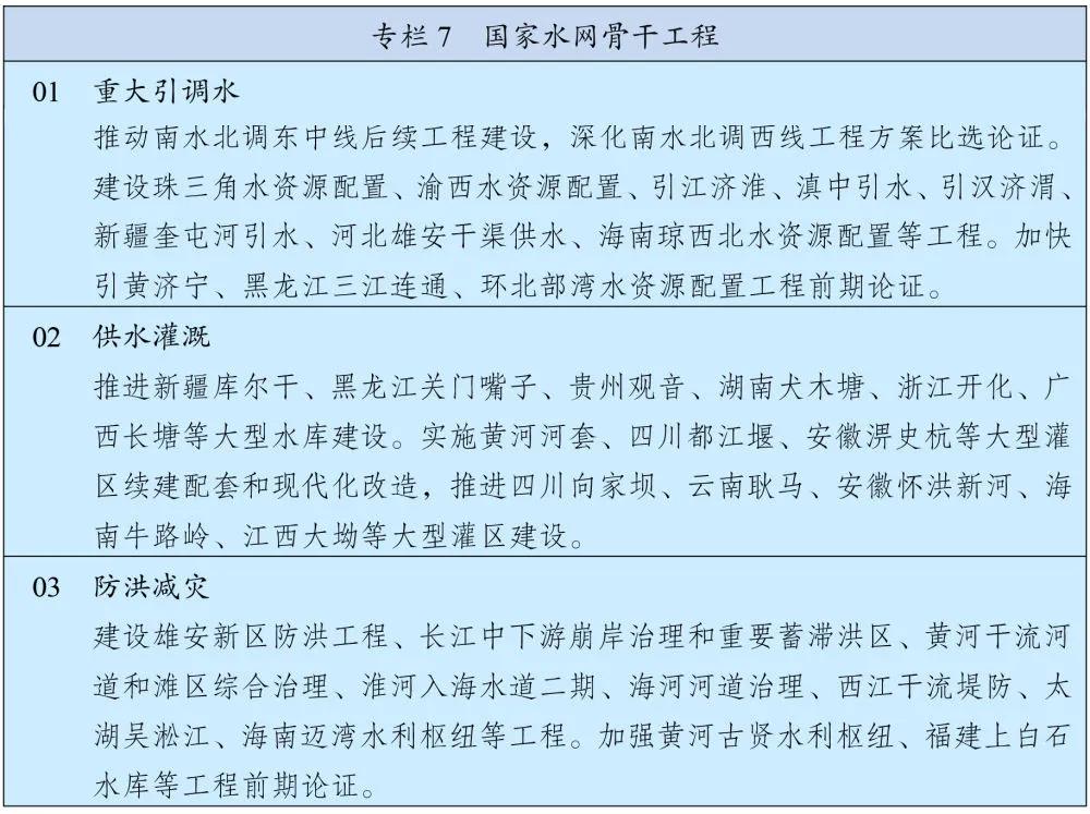 國家水網骨干工程 加強跨行政區河流水系治理保護和骨干工程建設,強化大中小微水利設施協調配套。 加強重點水源和城市應急備用水源工程建設。 實施防洪提升工程,全面推進堤防和蓄滯洪區建設。