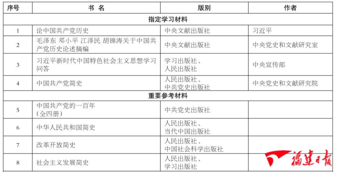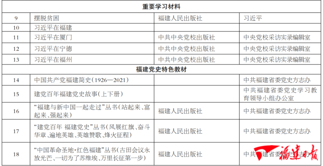 為扎實推進我省黨史學習教育深入開展,日前,省委黨史學習教育領導小組辦公室發布黨史學習教育推薦書目,包括指定學習材料、重要參考材料、重要學習材料、福建黨史特色教材等四類18種圖書,供廣大黨員干部學習使用。 省委黨史學習教育領導小組辦公室要求,廣大黨員干部要堅持讀原著、學原文、悟原理,通過理論學習中心組學習、“三會一課”、學習分享會等形式,深入研讀指定學習材料,用好重要參考材料,推動廣大黨員干部牢固樹立唯物史觀,強化理論思維、歷史思維,深入理解把握馬克思主義中國化成果特別是習近平新時代中國特色社會主義思想的科學性真理性。堅持學習黨史與學習新中國史、改革開放史、社會主義發展史相貫通,與學習中國共產黨福建地方史相貫通,把學習黨史與總結經驗、觀照現實、推動工作相貫通,引導黨員干部提升黨性修養,樹立正確的歷史觀、民族觀、國家觀、文化觀,感悟初心使命,激發奮斗動力,加快全方位推動高質量發展超越,以優異成績慶祝建黨一百周年。 中共福建省委黨史學習教育領導小組辦公室向黨員干部推薦學習書目