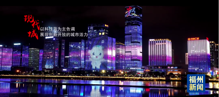 以科技藍為主色調,配合《我們都是追夢人》奮進奔放的旋律,運用“數娃”、航空、海港等現代元素,展現福州創新開放的城市活力。