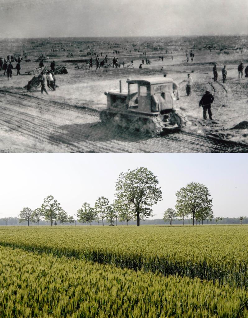 拼版照片:上圖為20世紀60年代河南省蘭考縣改造鹽堿地的情形(資料照片);下圖為蘭考縣堌陽鎮的一片麥田(2014年5月5日新華社記者朱祥攝)。新華社發
