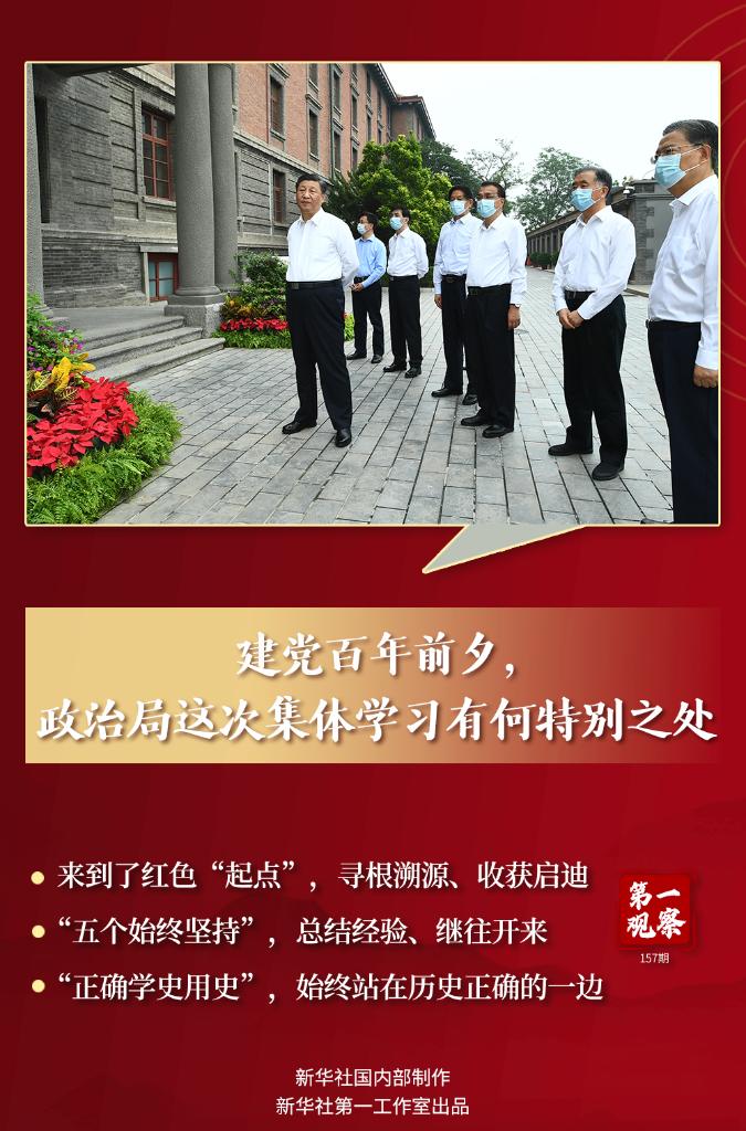 6月25日下午,中共中央政治局進行了一次集體學習。 黨的十八大以來,在“七一”前夕進行集體學習幾乎成為慣例,而且學習主題都與“黨的建設”相關。 今年正值黨的百年華誕。這次集體學習更具新意和深意。 從主題看,鮮明深遠——用好紅色資源、賡續紅色血脈; 從內容看,頗具深意——安排了兩項活動,一是參觀北大紅樓與中國共產黨早期北京革命活動主題展,一是參觀瞻仰豐澤園毛澤東同志故居; 從形式上看,豐富鮮活——采取參觀和討論相結合的形式。在參觀之后,習近平等領導同志回到了中南海懷仁堂,圍繞主題進一步開展學習。此前有兩次集體學習也是走出了中南海,2013年把“課堂”搬到中關村,2019年則前往新聞單位媒體融合發展第一線,采取調研、講解、討論相結合的形式進行。 參觀學習的行程安排,凸顯了深入紅色發源地,探尋百年大黨夢想與使命、汲取奮進力量的重要意義。 北大紅樓是五四運動的發源地、中國共產黨早期重要活動地。中國共產黨創始人李大釗、陳獨秀等在這里探尋救國救民的真理,青年毛澤東在這里如饑似渴地汲取知識和思想營養。