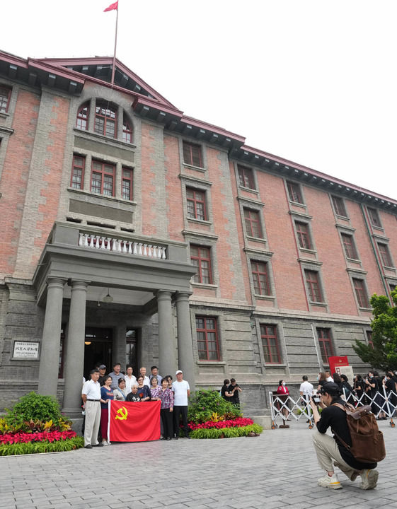 6月29日,參觀者在北大紅樓外合影留念。修繕后的北大紅樓舊址6月29日起重新向公眾開放,“光輝偉業 紅色序章——北大紅樓與中國共產黨早期北京革命活動”主題展覽也于同日亮相,豐富的圖片、文物帶領觀眾追尋紅色起點,傳承紅色血脈,汲取前行力量。新華社記者 鞠煥宗 攝 在北京市東城區五四大街29號,一座以紅磚砌筑、紅瓦鋪頂的樓體建筑靜述著紅色的歷史煙云,這座建筑是始建于1916年、落成于1918年的北大紅樓。這里曾是北京大學校部、一院(文科教學樓)和圖書館的所在地,李大釗、毛澤東等人開展早期革命活動的重要場所。新文化運動、五四運動在此相繼展開,北京的共產黨早期組織在此孕育誕生。 29日上午,來自北京市第六十五中學、清華大學等多家單位的參觀者提前預約、分批次進入北大紅樓進行參觀學習。