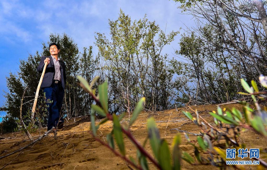 在青海省貴南縣森多鄉,生態管護員吉本加在巡查黃沙頭防風林(2013年9月10日攝)。新華社記者 吳剛 攝