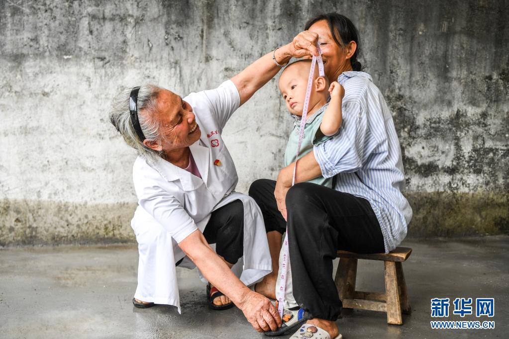 廣西賀州市鐘山縣兩安瑤族鄉竹梅村的鄉村醫生王秋姣(左)上門體檢時給小朋友測量身高(5月11日攝)。新華社記者 曹祎銘 攝