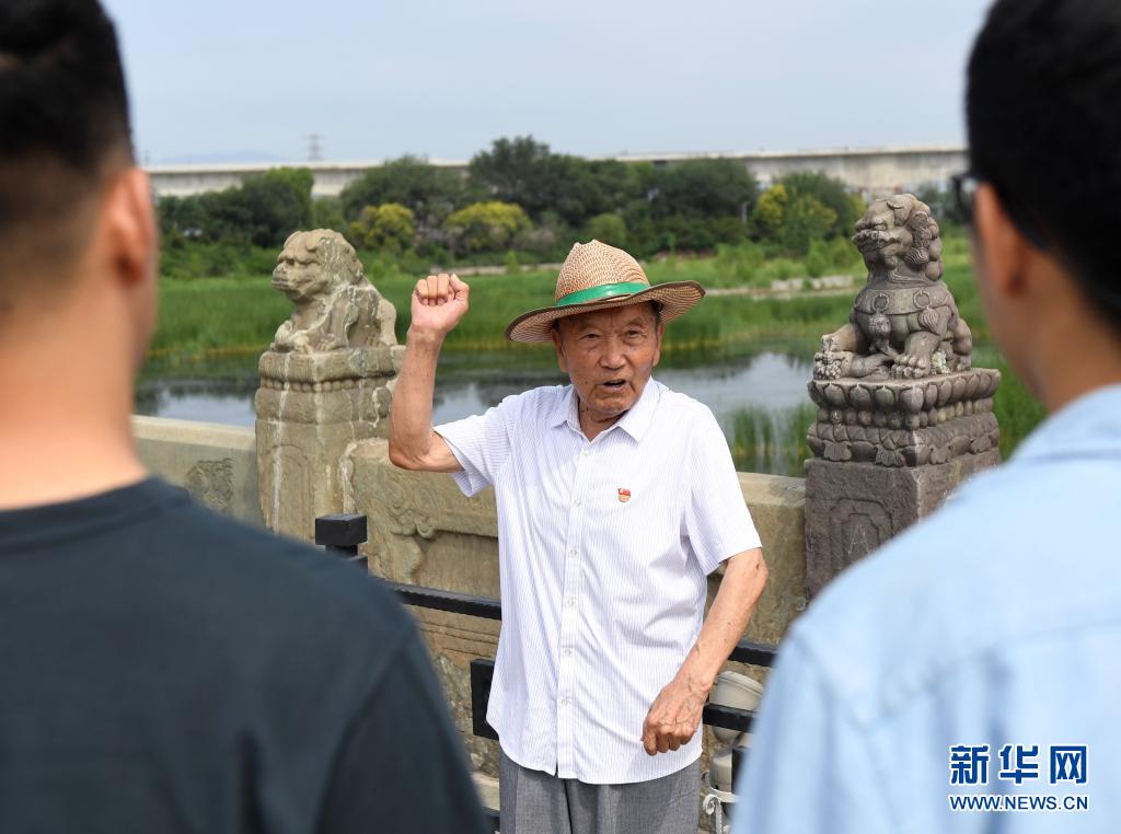 7月5日,鄭福來老人在北京盧溝橋為游客講述抗戰歷史。新華社記者 張晨霖 攝 頭頂遮陽帽,漫步盧溝橋,觸摸石獅子,作為“七七事變”的親歷者,90歲的“光榮在黨50年”紀念章獲得者、“時代楷?!睒s譽獲得者鄭福來老人,為了讓后人銘記那段刻骨銘心的歷史,仍堅持在炎炎夏日中,向來往的游客介紹他眼中的抗戰故事。 84年前,“七七事變”爆發,中華民族遭受了前所未有的劫難?!拔彝辽灵L在盧溝橋,一輩子就生活在這兒?!咂呤伦儭臅r候我6歲,那時慘烈的景象我到現在還記憶猶新?!编嵏碚驹跇蛑醒脒h眺著宛平城門回憶道,那個晚上,他在密集的槍炮聲中驚醒?!拔壹揖妥≡诒R溝橋西,離那兒不足50米。那天晚上,震耳欲聾的炮彈聲差不多響了一宿。頭一天還跟我一起玩兒的小伙伴,當晚就被落在家門前的炮彈給炸死了!”