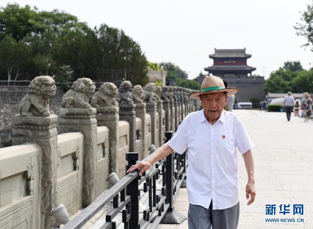 7月5日,鄭福來老人走在北京盧溝橋上。新華社記者 張晨霖 攝 說著過去的經歷,老人聲音有些哽咽?!爱敃r駐守在盧溝橋附近宛平城的是國民革命軍第29軍,那晚過后,很多戰士都犧牲了?!编嵏碚f,就在自己平時常去玩耍的一小片松樹林里,擺放了很多戰士的遺體。盡管那時候他還小,但不屈的抗戰精神早已深深烙在他的腦海里?!皡羌业亩?、任大嘴,還有很多其他鄉親被侵略者殘忍殺害了,盧溝橋和宛平城門上的彈痕就是見證?!?/p> 受到抗日戰士們英勇氣概的強烈感染,鄭福來在心中埋下了革命的種子。他18歲參加革命工作,不久后正式加入中國共產黨,此后還以盧溝橋鎮政府民政委員的身份前往天安門廣場參加開國大典。從此,他的全部青春完全凝結在首都的建設中。1952年當選為盧溝橋鎮第一任鎮長,同年接待美國記者愛潑斯坦,1959年帶著群眾為首都十大建筑供應砂石料……在很多重大歷史的進程中,都有他的身影。