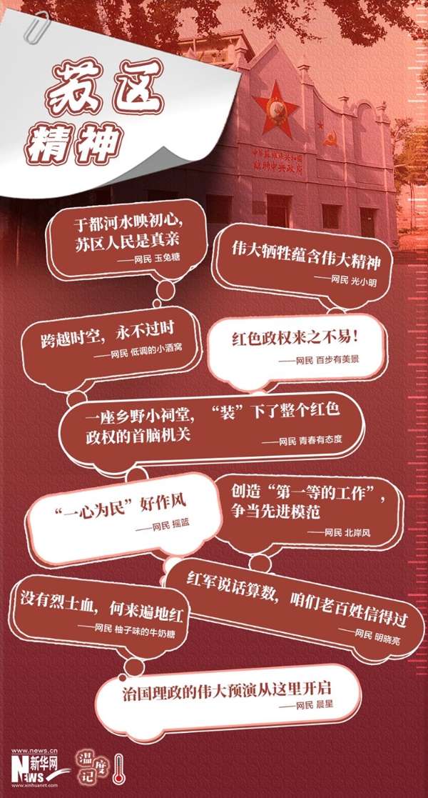 “永遠向上的精神火焰”系列網評之三: “蘇區干部好作風,自帶干糧去辦公,日著草鞋干革命,夜打燈籠訪貧農?!边@首至今傳唱的山歌,體現了中國共產黨人的優良作風和艱苦奮斗精神,表達了當年蘇區人民對蘇區干部好作風的贊頌之情。 光陰流轉,斗轉星移,“人民至上”的初心始終不渝。當年蘇區如火如荼的革命斗爭已成歷史記憶,但偉大的蘇區精神仍然閃爍著新的時代光芒。社交平臺上的網民們關于蘇區精神的留言,再次讓我們感受到以堅定信念、求真務實、一心為民、清正廉潔、艱苦奮斗、爭創一流、無私奉獻等為主要內涵的蘇區精神的力量。這一精神是無數革命先輩用鮮血和生命鑄就的,是我們融入血脈的信仰,有著生生不息的力量。(文字:董璐 海報設計:王曄)