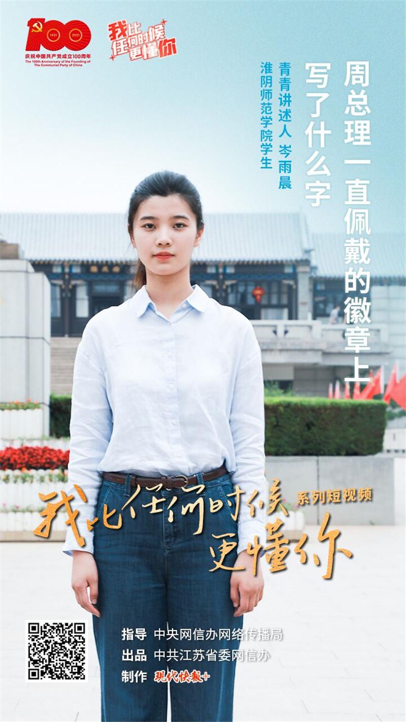 8 月 16 日," 我比任何時候更懂你 " 系列短視頻第 23 集《周總理一直佩戴的徽章上寫了什么字?》上線。本集青青講述人是淮陰師范學院學生岑雨晨。 她說,作為一名 00 后,認識和了解周總理,大部分是從影視劇、書本中開始的,而來到位于淮安的周恩來紀念館,自己對周恩來總理的認識更不一樣了。