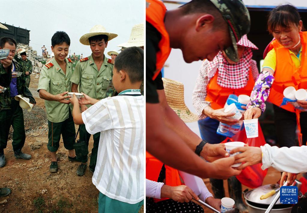 這是一張拼版照片,左圖為:在江西永修,學生為護堤搶險的武警官兵送水(新華社記者宋振平攝于1998年7月28日);右圖為:在江西鄱陽江家嶺村,村民為前來抗洪搶險的武警官兵盛綠豆湯(新華社記者周密攝于2020年7月11日)。新華社發