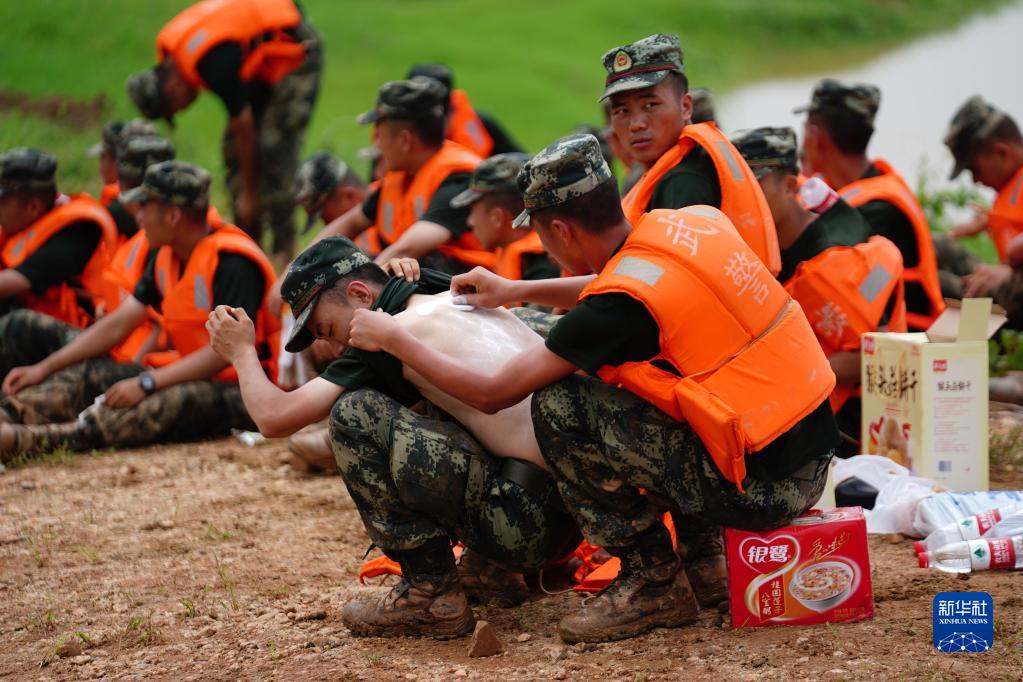 在江西省鄱陽縣鄱陽鎮江家嶺村,武警官兵在休息時互相涂抹藥粉,連日奮戰讓許多戰士長痱子或曬傷(2020年7月11日攝)。來自武警江西省總隊機動支隊的官兵與當地干部、村民一起連續奮戰,用沙袋和土石在昌江堤上壘起了一道一米多高、三公里長的臨時防水墻。新華社記者 周密 攝