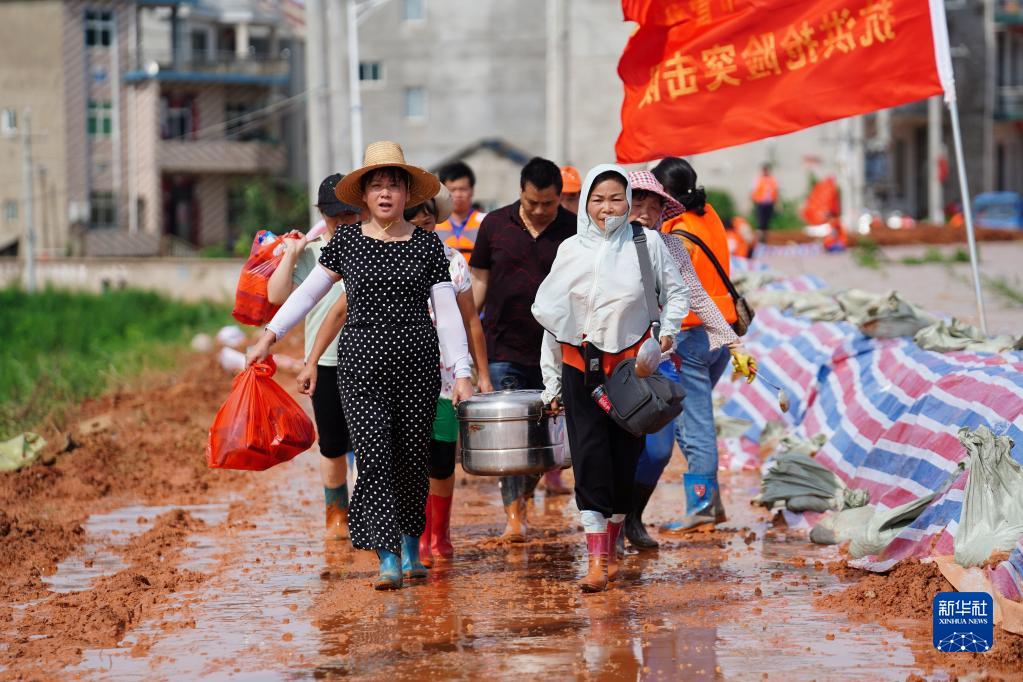 在江西省鄱陽縣鄱陽鎮江家嶺村,由平均年齡超過五十歲的阿姨們組成的抗洪“阿姨團”給武警戰士送來綠豆湯(2020年7月11日攝)。新華社記者 周密 攝