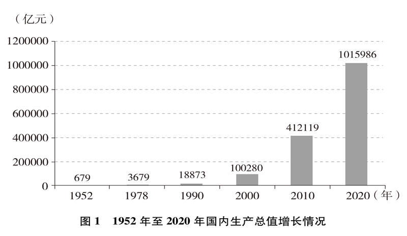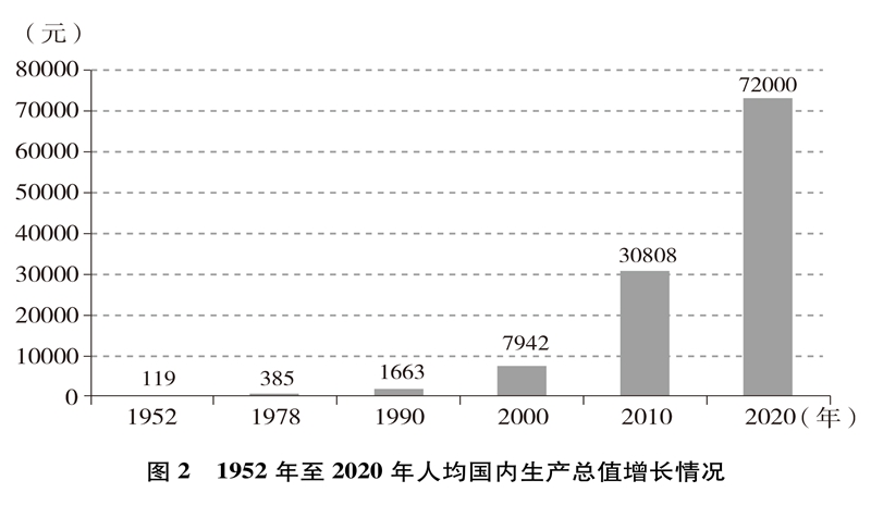 經濟實力大幅提升。中國國內生產總值從1952年的679.1億元躍升至2020年的101.6萬億元,經濟總量占全球經濟比重超過17%,穩居世界第二大經濟體(圖1)。人均國內生產總值從1952年的幾十美元增至2020年的超過1萬美元,實現從低收入國家到中等偏上收入國家的歷史性跨越(圖2)。制造業增加值多年位居世界首位,220多種工業產品產量居世界第一,自2010年起連續11年位居世界第一制造業大國。中國已是全球貨物貿易第一大國、服務貿易第二大國、商品消費第二大國、外匯儲備第一大國,2020年利用外資居全球第一。不斷邁向共同富裕的14億多人口,其中有超過4億并不斷擴大的中等收入群體,是全球最具成長性的超大規模市場,中國經濟充滿活力,具有巨大潛力和充足后勁。2020年,中國率先控制新冠肺炎疫情,率先復工復產,率先實現經濟增長由負轉正,充分彰顯中國經濟的強勁韌性。