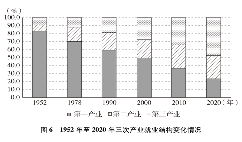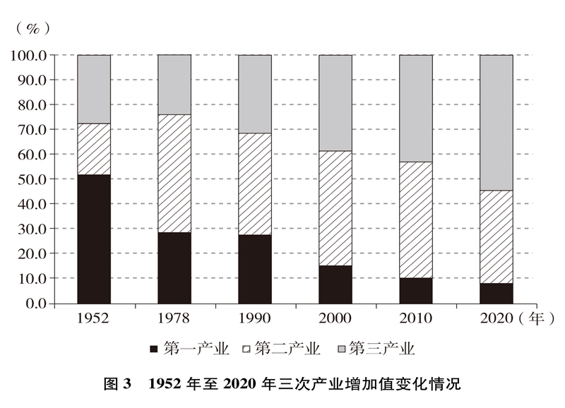 產業結構優化升級。中國已建成世界上最完整的產業體系,產業發展持續向中高端邁進。三次產業增加值之比從1952年的50.5∶20.8∶28.7到2020年的7.7∶37.8∶54.5,中國從傳統農業大國成為工業大國、服務業大國(圖3),中國經濟從依賴單一產業為主轉向依靠三次產業共同帶動。農業現代化成效顯著,機械化、數字化、綠色化、功能化、共享化水平明顯提高,廣大農民逐步告別“面朝黃土背朝天、一身力氣百身汗”的辛勞,農村生產力極大解放;糧食生產能力穩步提升,實現谷物基本自給,中國人把飯碗牢牢端在自己手中。中國建成門類齊全、獨立完整的現代工業體系,工業化和信息化融合發展的廣度和深度不斷拓展,“中國制造”向“中國智造”轉型升級,產業鏈供應鏈現代化水平進一步提升。以新一代信息技術、生物技術、高端裝備、綠色環保為代表的戰略性新興產業發展迅速,成為引領高質量發展的重要引擎。數字經濟激發經濟發展新活力,產業數字化和數字產業化趨勢加快?,F代服務業加速發展,以“互聯網+”為標志的新業態、新模式層出不窮,平臺經濟、共享經濟蓬勃興起,生產性服務業向專業化和高端化發展,生活性服務業向精細化和高品質轉變。產業結構的優化升級促進了經濟更加均衡、更加充分的發展,人們個性化品質化多樣化需求不斷得到滿足。