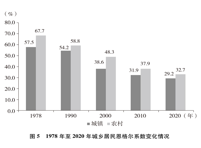人民生活水平顯著提高。居民收入持續增加,全國居民人均年可支配收入從1978年的171元增加到2020年的32189元(圖4)。城鄉居民恩格爾系數分別從1978年的57.5%、67.7%下降到2020年的29.2%、32.7%(圖5),城鄉居民生活質量不斷提升。溫飽問題解決后,人們對生活品質、品位有了更高的追求,衣食住行不斷升級,消費結構從生存型逐漸向發展型、享受型過渡。衣,從穿暖到穿美、穿出時尚;食,從吃飽到吃好、吃出健康;住,從有所居到更敞亮、更宜居;行,從便利通暢到快捷舒適。吃穿用有余,家電全面普及,乘用汽車快速進入尋常百姓家。餐飲、健康、教育、旅游、文娛等服務性消費持續快速增長,在居民人均消費支出中占比逐漸達到一半左右。越來越多的人有“錢”有“閑”,“詩和遠方”更加觸手可及,“說走就走”不再是夢想,旅游扮靚人們的幸福生活,中國正在進入大眾旅游時代。